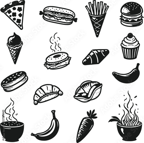 Black and White Food Icons Pizza Burger Fries Ice Cream and More