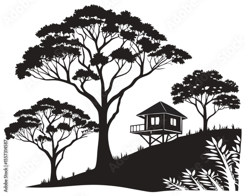 Black and white forest scene with trees cabin and transparency for versatile designs