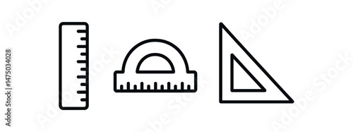 Black and white geometric tools icon set with ruler, protractor, and triangle