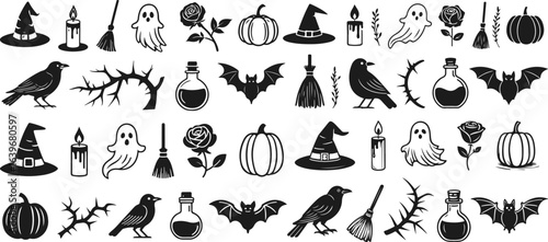 Black and White Halloween Icon Set – Hand-Drawn Spooky Elements Featuring Ghosts, Pumpkins, Witch Hats, and More for Seasonal and Magical Design Projects