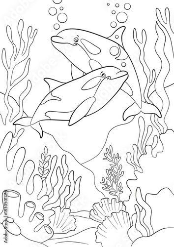 Black and white line art coloring page. Marine wild animals.A cute mother orca and her happy calf smiling at each other while swimming through a vibrant underwater coral reef with seaweed.