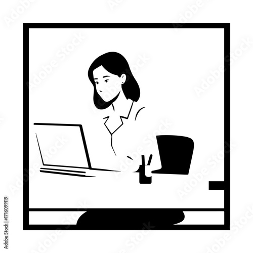 Black and white line art of a beautiful successful career woman working at desk with laptop illustration