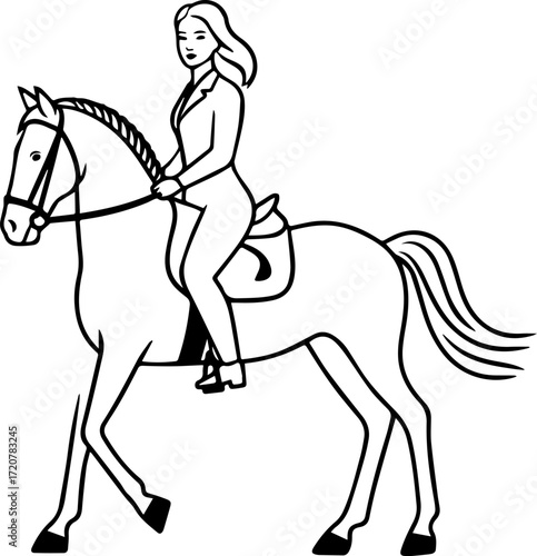 Black and white line art of a beautiful woman with perfect body riding horse elegant minimalist illustration