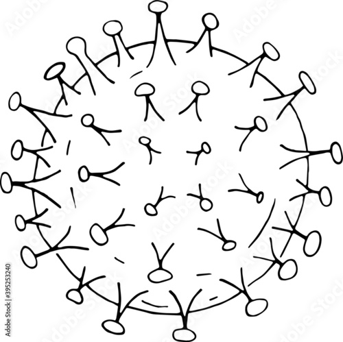 Black and white line work hand drawn cartoon cell of covid 19.