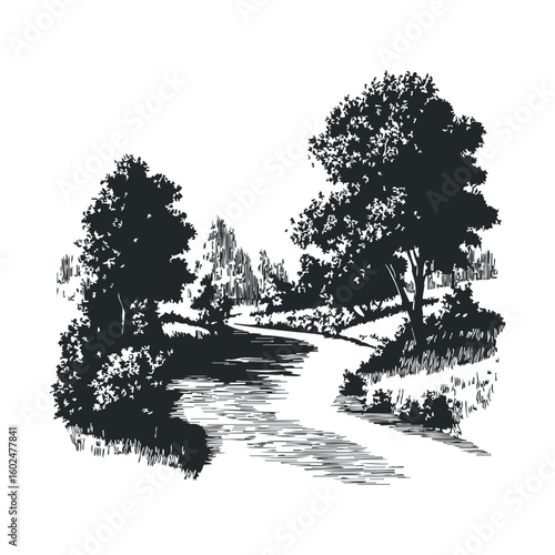 Black and white nature scene with river and trees in ink drawing