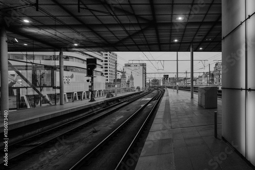 Black and white of a modern train station platform with tracks leading into the distance