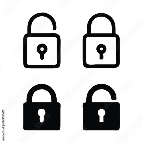 Black and white padlock icons unlocked and locked security