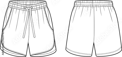 Black and white shorts illustration, athletic running shorts vector, casual sportswear line art, summer fashion drawing, activewear design