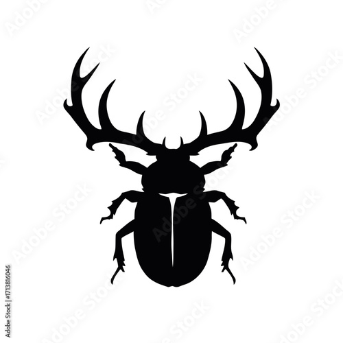 Black and white silhouette of a stag beetle with prominent horns and antlers