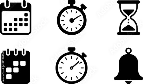 Black and white time management icons: calendar, stopwatch, hourglass, and bell vector illustration vector