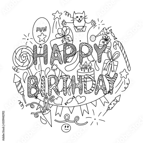Black and white Vector illustration. Birthday card concept. Set of elements with the inscription 'Happy birthday'