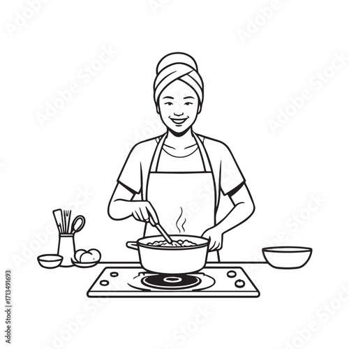 Black and White Vector Illustration of a Smiling Woman Cooking in Kitchen with Apron and Headband