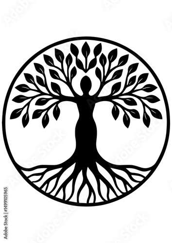 Black and white vector Tree of Life with a female-shaped trunk in a circle. Ideal for engraving, logos, prints, and creative projects