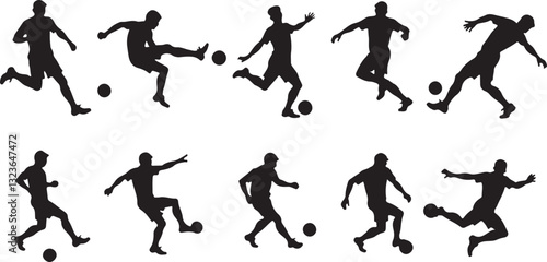Black and white vectorized image of a soccer player silhouette. The image has a set of various poses that soccer players are in during a match. Transparent background. Generated in AI.