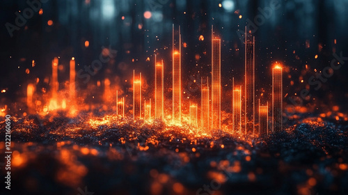 Black bar graph engulfed in flames and sparks with a dark background of digital financial charts minimalistic bright tone modern blurred empty space symbolizing chaos and volatility