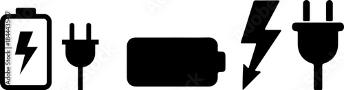 Black battery and electric plug icons with lightning bolts