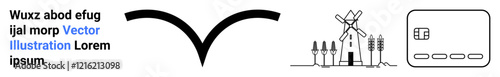 Black bird flying in the sky, detailed windmill in a field with trees and bushes, and a house icon with windows. Ideal for environmental themes, renewable energy, rural scenes, simplicity