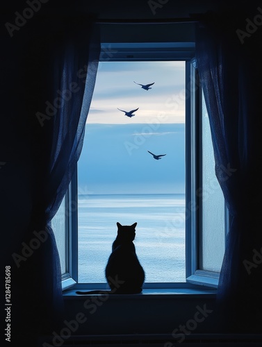 Black cat looking birds flying over the sea from window