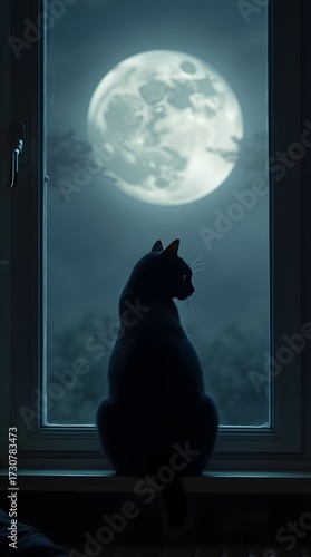 black cat sitting on the window full moon behind