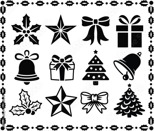 Black Christmas Icons Set – Holiday Silhouette Clipart of Tree, Bell, Gift, Star, Holly, Bow