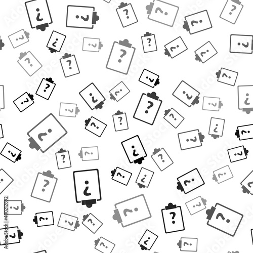 Black Clipboard with question marks icon isolated seamless pattern on white background. Survey, quiz, investigation, customer support questions concepts. Vector Illustration.