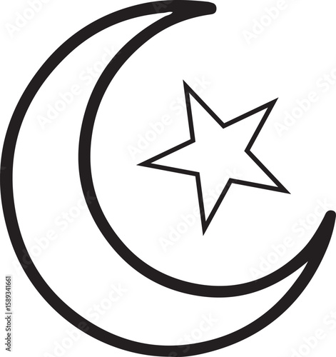 Black crescent moon and star icon on white background for Islamic religious holidays and