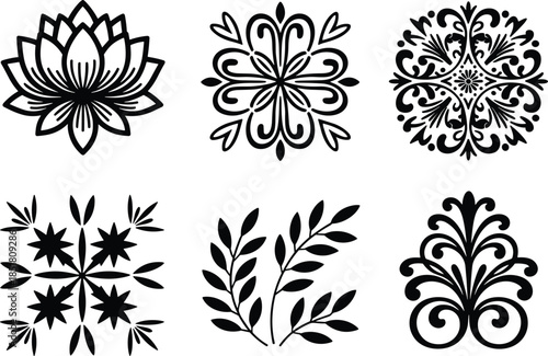 Black decorative floral and geometric motifs on white background vector illustration