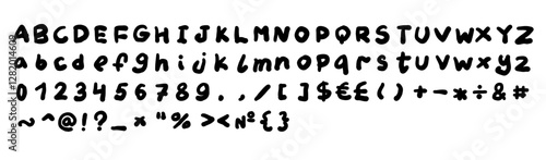 Black doodle english latin abc alphabet font with digits and symbols handwritten A to Z, 0 to 9 collection. Vector illustration in hand drawn scribble style isolated on white background. Design, menu.