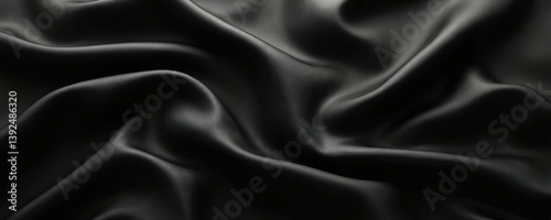 Black fabric background with copy space. Elegant flowing silk texture. Shiny draped material. Decorative design template wallpaper. Luxurious fashion backdrop.