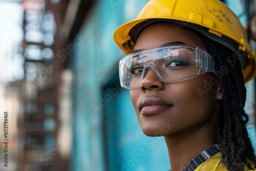 Black female builder working on a business construction site. African American architect contractor wearing safety protective uniform and a yellow hardhat. Celebrating inclusion, Generative AI
