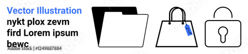 Black folder, shopping bag with blue tag, and lock emphasizing data organization, retail, and digital security. Ideal for technology, e-commerce, business, organization security minimalism flat