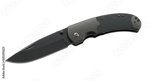 Black folding knife with textured grip and shiny blade design