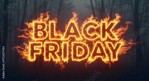 Black friday text engulfed in flames, representing a sale or discount event with intense and fiery energy, set against a dark, moody forest background