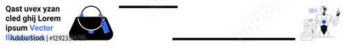 Black handbag with blue details, alongside a professional setting of charts, graphs, and figures representing teamwork, success, and strategy. Ideal for fashion, retail, corporate branding creative