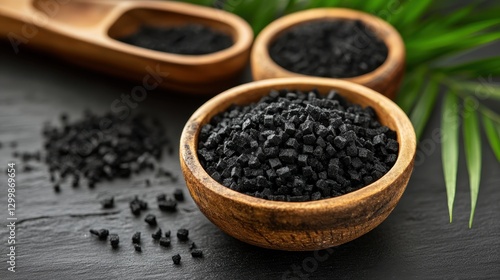 Black lava salt in wooden bowls, close-up. Perfect for culinary, health, or spa themes, showcases texture and color.