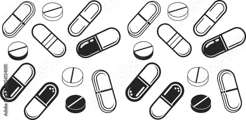 Black Line Capsules Icons Set including Flat Medicine Health Drug and Pharmaceutical Symbol Collection with Minimal Capsule Icon Group for UI Web Medical Treatment and Healthcare Design Projects