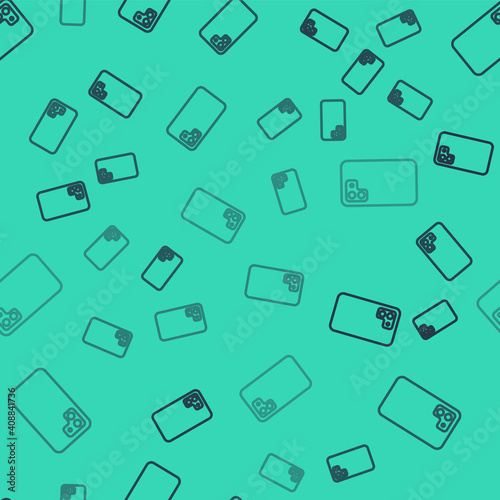 Black line Smartphone, mobile phone icon isolated seamless pattern on green background. Vector.