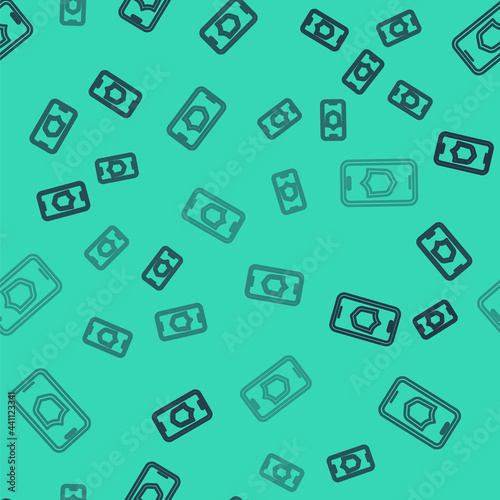 Black line Smartphone, mobile phone with security shield icon isolated seamless pattern on green background. Security, safety, protection concept. Vector