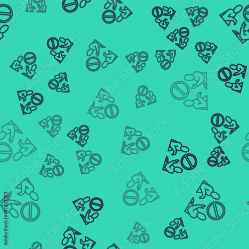Black line Stop plastic pollution icon isolated seamless pattern on green background. Ecological poster. Vector Illustration