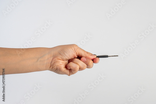 Black locker key in hand on white background