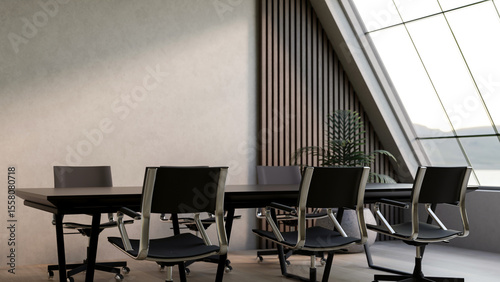 Black long table and swivel chairs with sloped roof window in a meeting room in office or company.