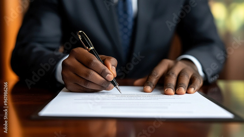 Black man’s hand signing a contract, symbolizing commitment, agreement, and professionalism. Focus on the act of finalizing important documents