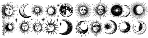 Black monochrome symbols isolated on white background. Sun moon face eye boho ray lines crescent solar signs.
