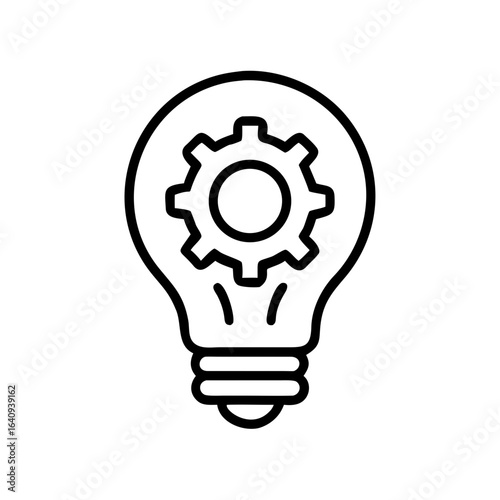 Black outline icon of a lightbulb with a gear inside, representing innovation, technical solutions, and ideas.