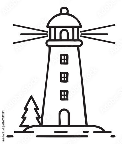Black outline icon of a tall lighthouse with beams of light and a small triangular tree beside it, suggesting navigation and guidance themes.