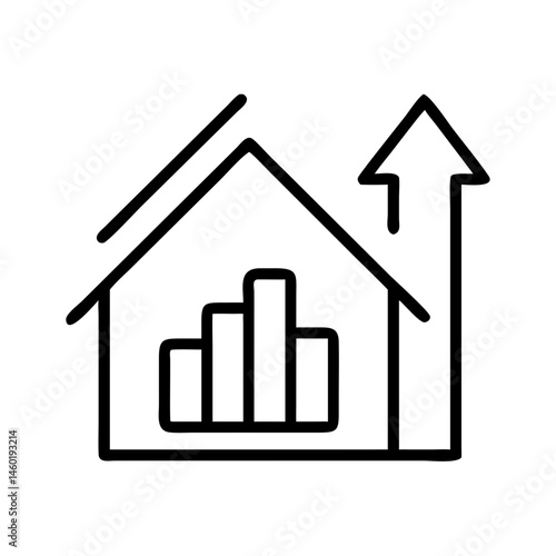 black outline icon of house with bar chart and upward arrow, real estate growth or market increase, minimalist vector on white background
