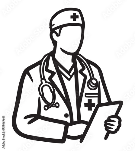 Black outline of a male doctor wearing a stethoscope and holding a clipboard, dressed in a medical uniform with a cross emblem.