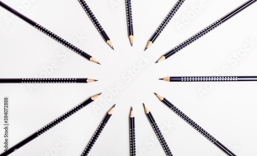 Black pencils are laid out in a circle on a light background.