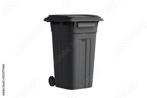 Black plastic garbage bin with lid and wheels isolated on white background for waste management, cleaning, and environmental themes