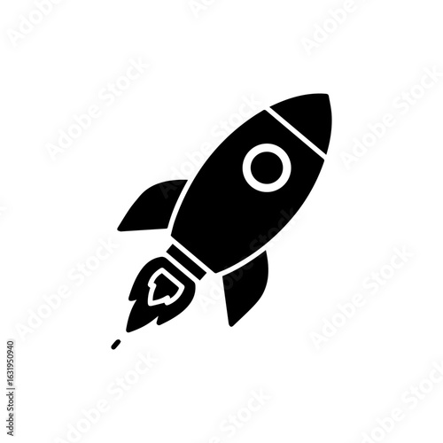 Black Rocket Silhouette with Flames and a Circular Window Ascending Upward.